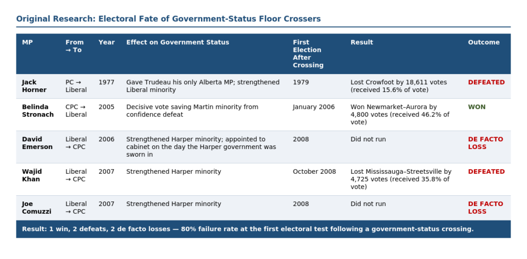 The scope is deliberately limited to crossings that changed government status for two reasons. First, this is the precise category of crossing that the five current 45th Parliament floor crossers represent — each contributed to moving the Carney government from minority toward majority, which is the democratic mandate question this Act directly addresses. Second, and more fundamentally, these crossings generate the strongest public reaction because they produce a consequence voters never sanctioned: a change in the effective governing mandate of the country. When an MP crosses the floor without affecting government status, voters can reasonably conclude that their representation has changed but the overall balance of power has not. When a crossing tips a minority into a majority — or sustains a government that would otherwise have fallen — voters lose something qualitatively different: the government they actually elected. It is therefore both analytically appropriate and historically consistent to examine this category separately. As the electoral data below confirms, voters have recognized and responded to this distinction at the ballot box.